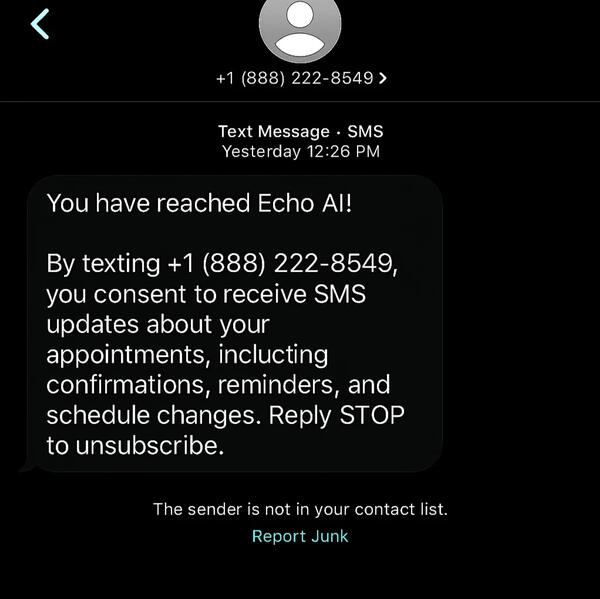 Below is an example of the confirmation message customers receive when they first contact the Echo AI messaging system.